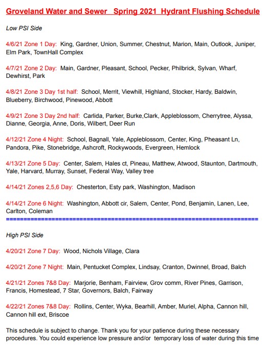 For additional information, questions, or concerns about the spring flushing please contact The Groveland Water and Sewer Department office at 978-556-7200.