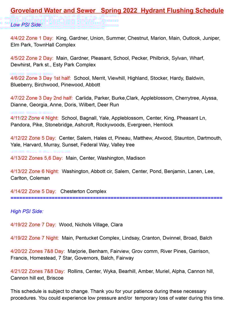 The Groveland Water and Sewer Department would like to share the Spring 2022 Hydrant Flushing schedule.
