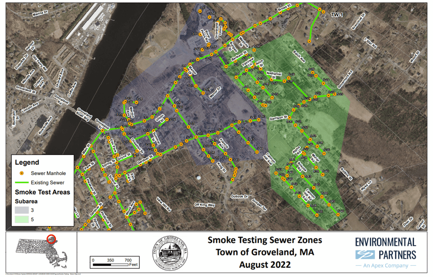 Smoke testing is an important part of the Department’s Sewer Infiltration and Inflow Program, which is required by MassDEP. As a part of the tests, white smoke will be blown into the sanitary sewer lines in the street to see where the smoke leaks out to eliminate outside sources of water from entering Groveland’s Sewer System.