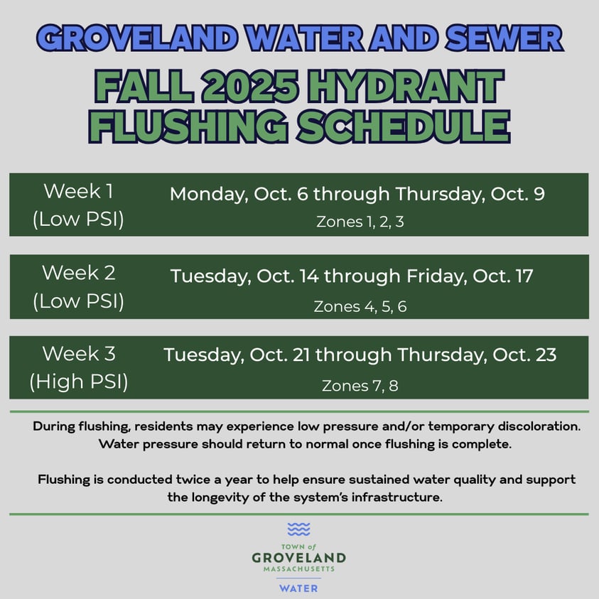 October 3, 2025 Flushing Revised Fall 2025 Hydrant Flushing ScheduleDownload Post navigation Previous Previous post: Groveland Water and Sewer, Board of Water Commissioners Announces Completion of Pilot Study Program, Reminds Residents of Level 2 Drought RestrictionsNext Next post: Fall 2025: Week 1 Hydrant Flushing Schedule
