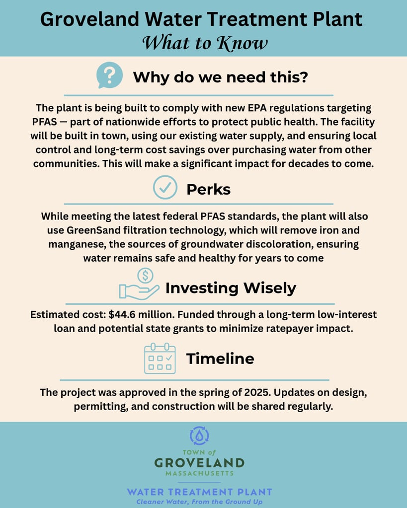 The Board of Water Commissioners has approved the construction of Groveland’s first water treatment plant, which will help the Town meet U.S. Environmental Protection Agency’s (EPA) updated PFAS guidelines.